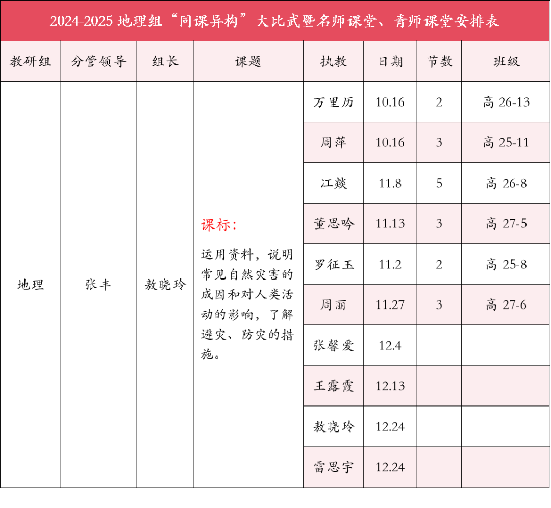 11 月 27 日,乐山立志达高级中学地理组开展了 11 月常态教研总结会。会议紧紧围绕 “同课异构” 大比武这一核心任务,积极探索如何将教育教学理论与实践深度融合,打造高品质的常态课堂。地理组全体教师以高度的责任感与使命感,深入剖析教学过程中的优势与不足,在总结经验的基础上,精准发力,力求让每一堂常态课都能彰显地理学科的魅力与教育价值,为学生的知识增长与素养提升筑牢基础,为地理教学的高质量发展提供持续动力与有力保障。 结合学校“同课异构”大比武暨名师课堂、青师课堂主题教研,地理组规划了本学期的公开课课题及时间安排。 本月,基于“同课”课标、学段学情,四位老师分别选取不同的微主题,在不同年级展示了“异构”的教学设计和生动的课堂。 同课异构,智启多元 11月8日 冮燚·高2026届8班 冮老师以寒潮为切入点,复习了寒潮的定义及对应的天气系统,引导学生重点讨论了寒潮的形成、影响因素以及利弊,提出相应的预防措施。生动的课堂让学生对寒潮有了更深入的了解,并让其学会如何将所学知识精准运用到实际情境之中。 11月13日 董思吟·高2027届5班 董老师以《滕王阁序》为导入,引导学生关注到鄱阳湖这一地理区域,从而激发学生们的学习兴趣。她以问题链的形式组织教学,重点探讨了洪涝和旱灾的自然成因、影响及旱涝灾害与社会经济活动的联系。通过对比分析法,加深了学生对旱涝灾害相关知识的认识。 11月20日 罗征玉·高2025届8班 罗老师从干旱灾害的概念入手,带领学生区分“干旱”与“干旱灾害”的不同概念,理解我国旱灾的时空分布特征。罗老师进一步以山东禹城和江淮地区的旱灾为例,剖析了两地不同的成因机制,从而引导学生学会对症下药,提出相应的旱灾防治措施。 11月27日周丽·高2027届6班 周老师以台风“摩羯”卫星云图作为课堂导入,利用“摩羯”的真实情境“一境到底”,设置了条理清晰的问题链,带领学生通过任务驱动进行思考、探究、辩论,进而帮助学生掌握台风的形成条件、认识台风结构、理解台风的时空分布及移动规律、辩证认识台风的影响、了解台风防御措施。 析课入微,论道致远 课后,地理组展开评课议课活动。与会教师从教学目标达成、方法运用、内容编排及课堂互动等方面进行深入研讨,总结教学得失,为今后地理教学实践指明方向,促进教学水平稳步提升。 观摩感悟,以研促教 赛场展技呈异彩,观赛启思明方向。会上,高2027届地理备课组长周丽老师为大家分享了2024年四川省地理赛课的观摩感悟,就其本月赴绵阳观摩的23节地理微格课堂、10堂现场教学进行了分享。 周丽老师谈到,一堂好课需要具备的五大特色:一是深化学科核心素养;二是以学生为本,三是激发学生自主性和积极性;四是注重小组合作探究;五是将信息技术与地理教学深度融合;六是构建知识结构化体系。教师应当以五大特色为导向,帮助学生从整体把握地理知识脉络,提升学习效率与效果,从而全方位打造一堂优质且高效的地理课。 同时,周老师还分享了一等奖优秀课堂的精彩片段。以课促思,以研促教,立高全体地理教师定会持续聚焦于学生的四大素养培育,教给学生能用的、会用的、有用的解决问题的能力和方法。 打造优课,提质增效 随后,教科部部长敖晓玲以“提质增效率,好课是王道”为题,从“好课”的定义、评价机制、落实策略同与会教师进行分享交流,并提出相关建议和要求。 敖部长指出,课堂要“有人”“有料”“有趣”“有变”“有效”。教师应以学生为中心,注重学生学习思维的培养,运用多样化的教学方法,及时调整教学节奏、策略与方法,通过合理的教学安排与实施,使学生在知识掌握、能力提升、素养培养等方面取得切实可测的成效,实现教学目标与教育价值的最大化。 敖部长还指出,课堂的量化评价版本众多,但万变不离其宗。教师应秉持 “学为主体,教为主导,启发诱导”的基本原则,保障学生学习活动科学、有序、合理进行,课堂气氛活跃,双边活动充分,最终达成良好的学习效果。 最后,敖部长再结合“得意忘形”新解,建议与会教师:好课的落实在于备课组集体研课,在于“老带新”互促。她特别鼓励年轻老师大胆实践,通过“模仿范式——范式改进——范式内发明——范式外发明”的成长路径,早日形成自己的独特教学风格。 授业、精学、深研。立高地理组必将以教研为基石、以课堂为阵地,秉持谦逊严谨的治学态度,积极吸纳组员的合理建言与深刻洞见,群策群力,矢志不渝地打造好每一节优质的常态课堂。
